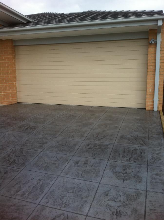 The 600 slate tile pattern here has a grey base with a black releasing agent. It can be done in all colours.The 600 slate tile pattern gives you the look of tiles or pavers with the strength of concrete it makes a very nice driveway or entertaining area.