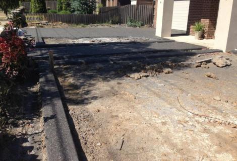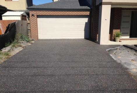 This exposed aggregate concrete drive way is in Mt Waverley the exposed aggregate mix is Montquartz 8 % std black.We poured a mower strip both left and right of the path and along the front to make for nice garden areras.
