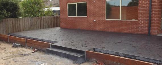 This slate impressions concrete was poured after we installed the redgum sleeper retainer wall.The retainer wall is redgum with gal H beam uprights.We left a 500mm garden bed and placed 2 x 2m concrete steps to gain access to the lower level.The concrete has a little rain water beading on the surface but the picture allows you to see the scope of works that were undertaken.